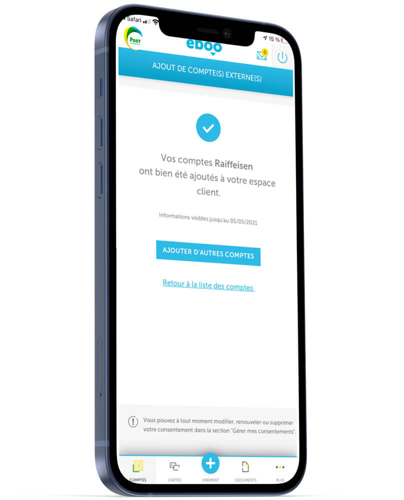 Multibanking ermöglicht es POST Finance-Kunden, direkt in der e-Banking-App eboo ihre verschiedenen Konten (Girokonten, R-TOP Sparkonto usw.) bei anderen Banken zusätzlich zu ihren bei POST geführten Konten anzeigen zu lassen.